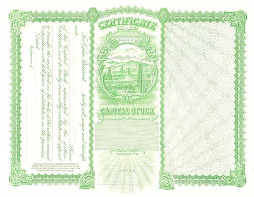 Stock Certificates are a market standard. They've been involved in lithography since 1879, being one of the progenitors of color printing. Know you will get a quality product. These share certificates are specifically designed for participants in the Energy Industry. Perforated Stubs of the elaborate Long Form Style make your record-keeping even stronger. Personalize as needed using a laser printer. Institutionalize the stockholder's commercial interest in your Oil or Gas business. Or simply use as a memento or gift. Here are some product
